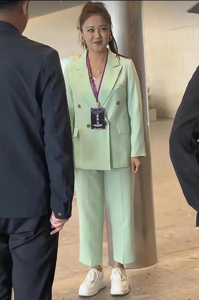 她穿着一身青绿色的套装,搭配一双白色的运动鞋,看上去非常干练,整个人颇有精英气场。